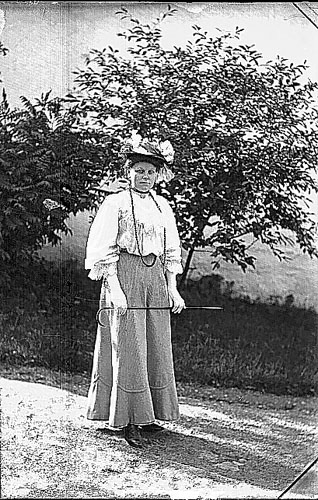 Mrs Barnaby från Stötarp m hatt och spatserkäpp.