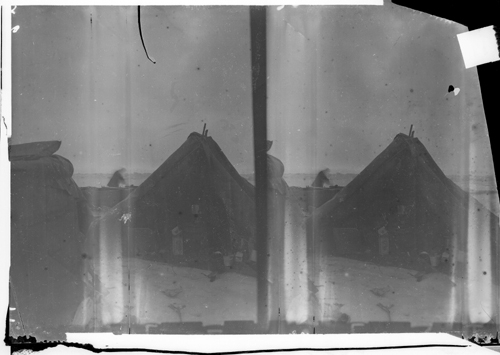 Oretuscherad. Stereoskopisk bild. Troligen S A Andrée i bakgrunden vid båten. I förgrunden till vänster del av gondolen, till höger tältet med bland annat primus-köket.