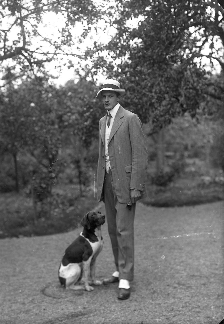 En man med hatt, handskar i ena handen och en hund vid sin sida står på en grusplan, troligen vid Västanå slott.