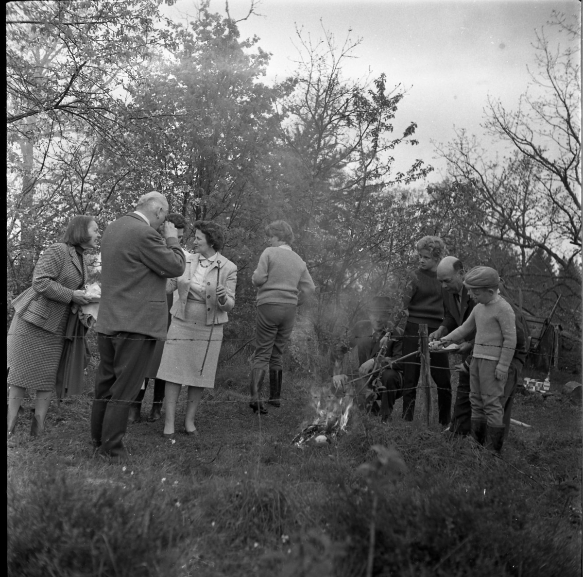 Barn och vuxna samlade runt en eld för korvgrillning. Det är gökotta, möjligen i Gränna Lions regi. Mannen till vänster är Sture Petri, till höger om honom står Margit Antonsson.
