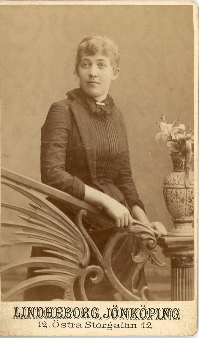 Kabinettsfotografi av en okänd ung kvinna som står vid ett skupturalt trappräcke och blomstervas.