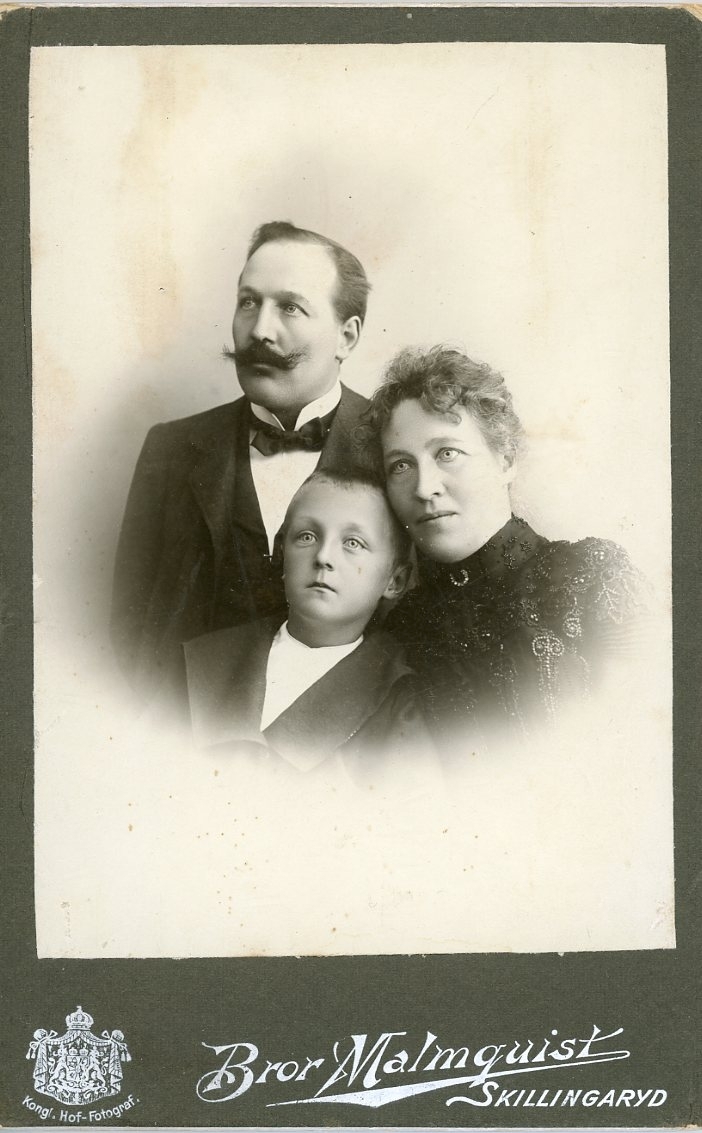 Kabinettsfotografi: en man, kvinna och en liten pojke tätt tillsammans. Mannen med stor mustasch.