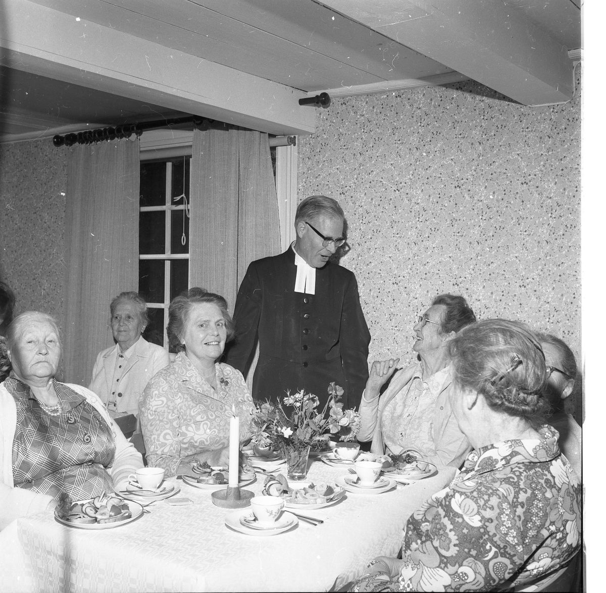 En präst står bland äldre kvinnor som sitter vid kaffebord, de samtalar och skrattar. Ett ljus är tänt på bordet.