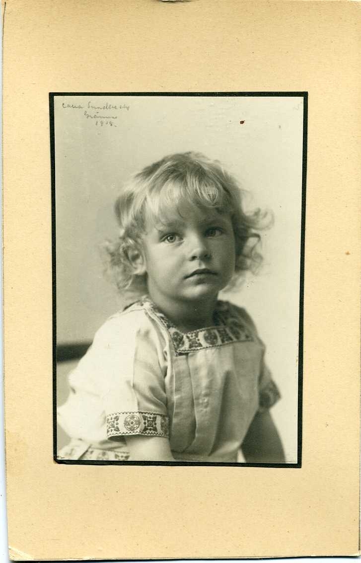 Porträtt av en ljushårig liten pojke med lockigt hår, i ljus särk med mönstrad bård.
