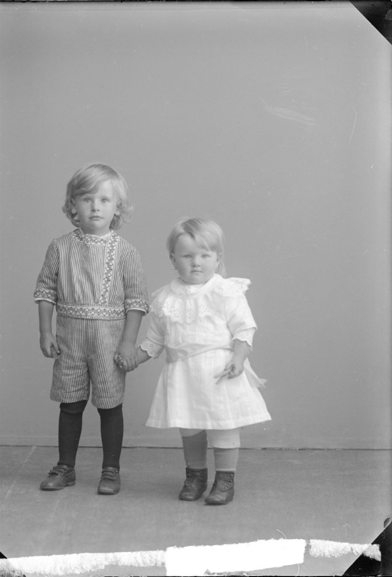 Porträtt av en liten pojke som håller sin lillasyster i handen.