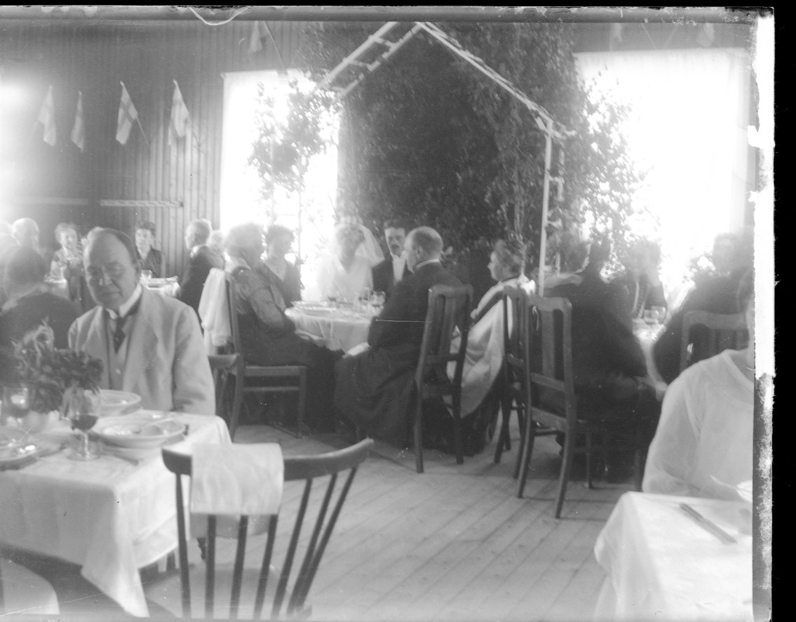 Bröllopsgäster vid matbord. Brudparet sitter i centrum under en portal med björkris.