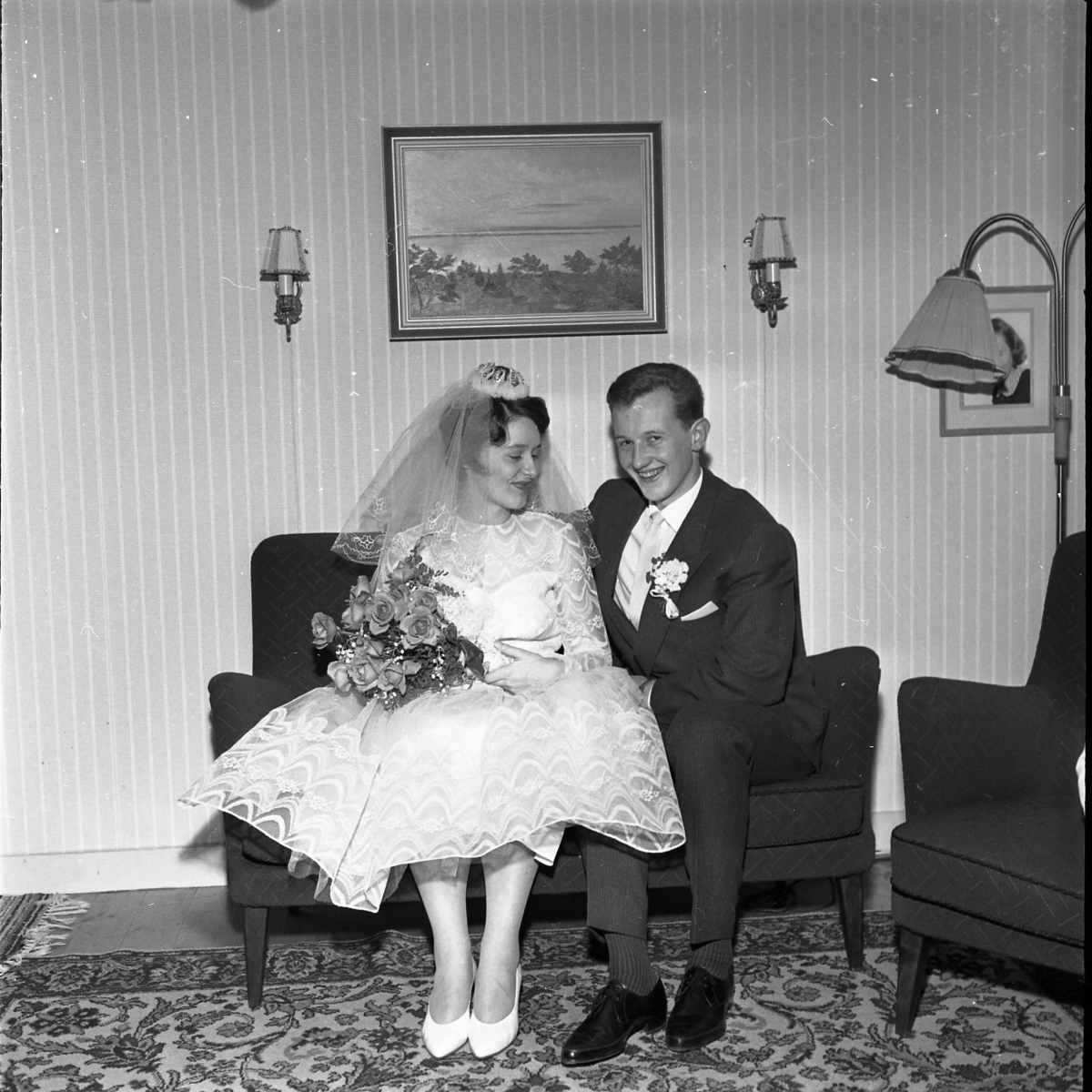 Ett bröllopspar sitter i en soffa, de ser väldigt glada ut. Brudgummen håller om bruden. Hon ser på hans corsage. Han tittar in i kamerna och ler. Hon har en bukett rosor i famnen. Hon bär slöja med en liten brudkrona på huvudet. De sitter i en hemmiljö med tavlor och lampetter på väggarna.