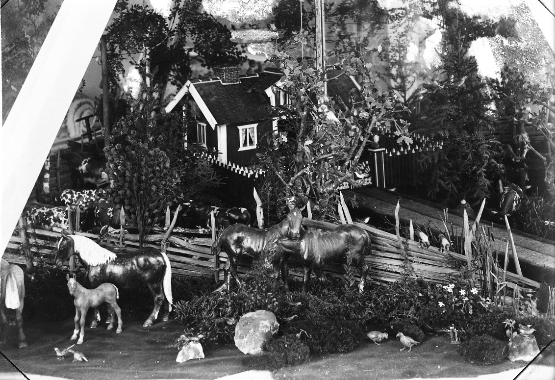 Fotografi av Fredrik Hård af Segerstads diorama med skulpterade figurer från livet på landet i Reaby: "Biologi i skulptur". I dioramat syns bland annat hästar, fåglar och fjäderfä.