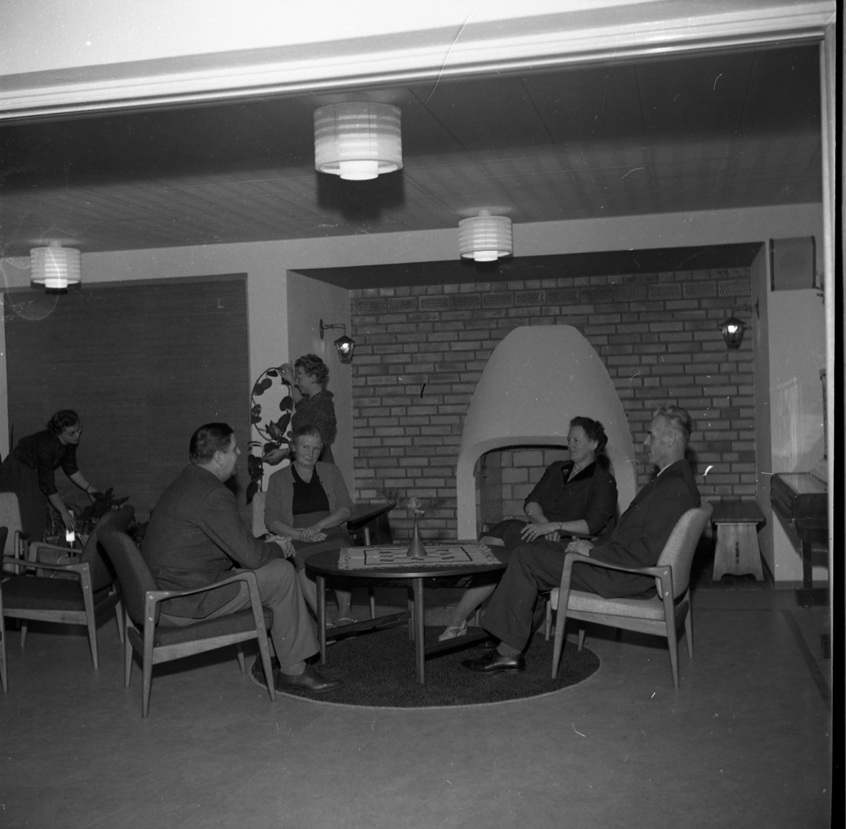 Fyra personer sitter och pratar runt ett bord. En kvinna står bakom dem och håller i en växt.