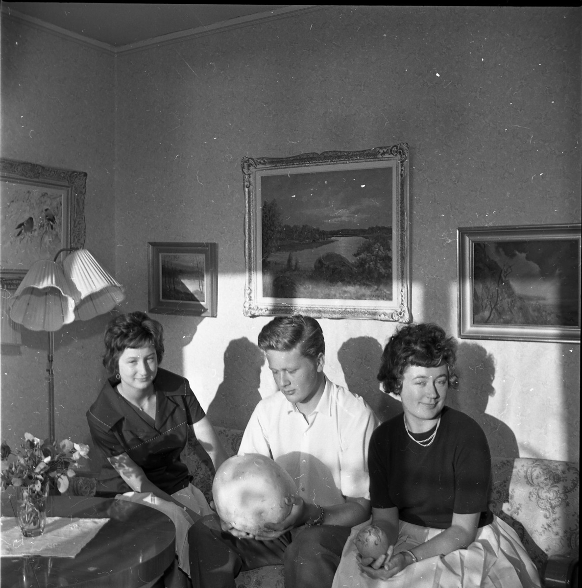 Tre personer sitter i en soffa i en hemmiljö. En man sitter i mitten och håller i vad som ser ut som en gigantisk röksvamp. Han tittar på svampen. Två kvinnor sitter på vardera sida om honom och tittar mot kameran.