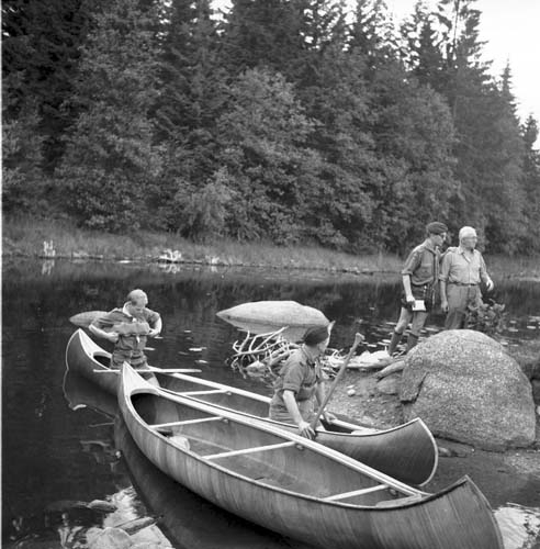 Två pojkar sitter i kanoter. De håller på att knuta sina flytkuddar runt bröstkorgen.