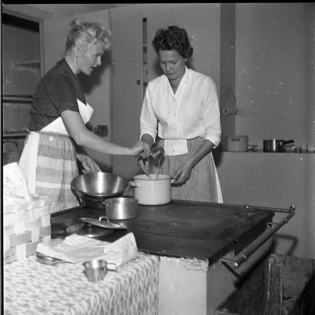 Två kvinnor arbetar vid en järnspis. Kvinnan till vänster är Birgit Roman.