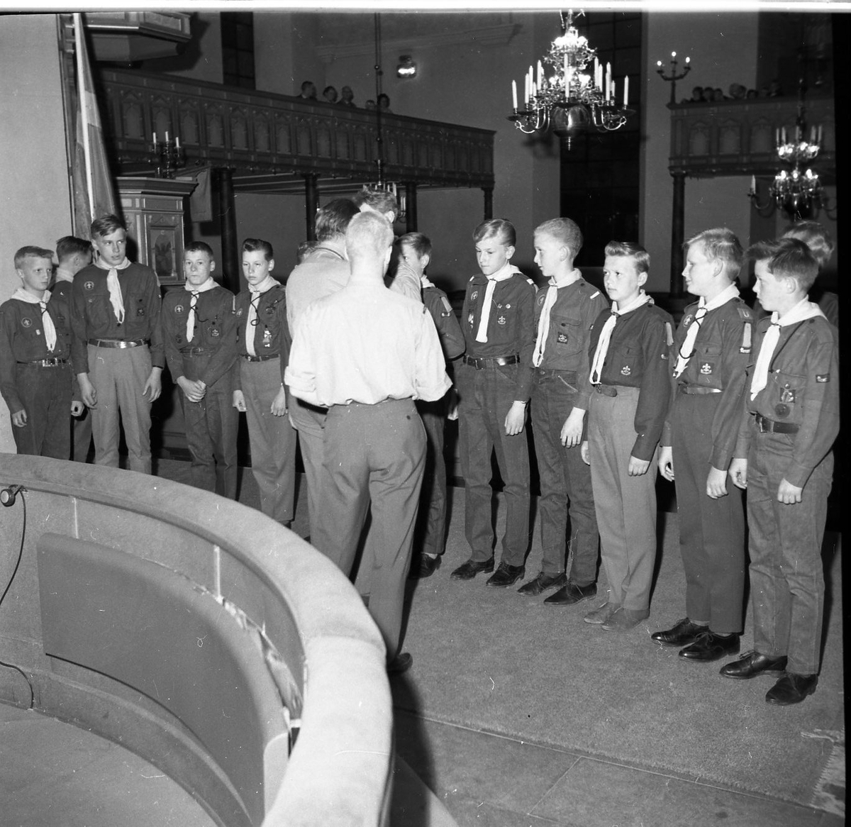 Unga scouter står uppradade framför en scoutledare. De befinner sig i en kyrka.