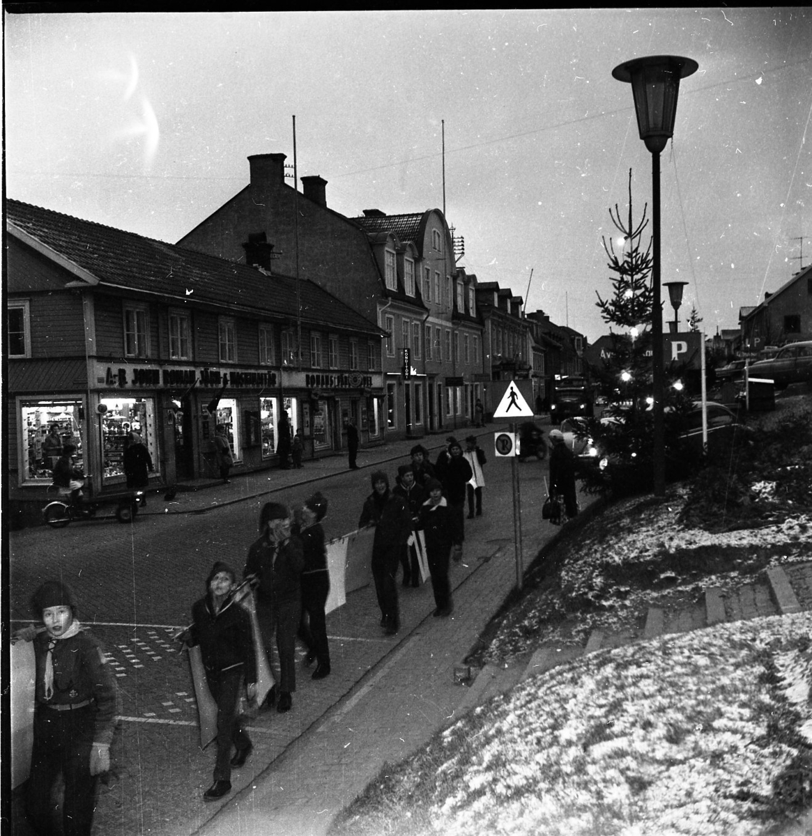 Ungdomsscouter går i mörkret på Brahegatan. Tända julgranar på torgmuren till höger. Det ligger lite snö på marken.