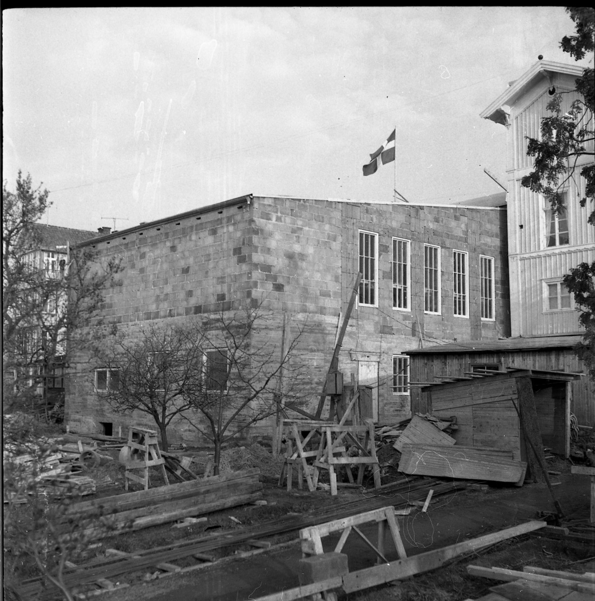 Byggnation av Filadelfiakyrkan är pågående. Fotograferat från gårdssidan av Brahegatan 75a (Hjertströmska gården). En svensk flagga är hissad på kyrkans tak.