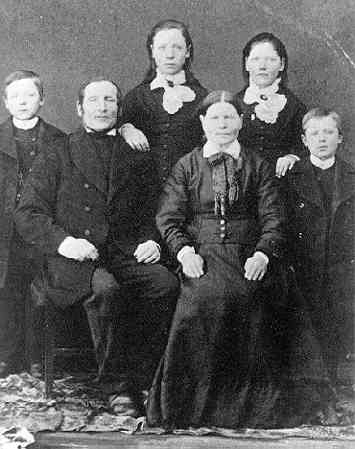 Gruppbild med familjen Sven Andersson. föräldrarna sitter på stolar omgivna av fyra barn varav två äldre flickor.