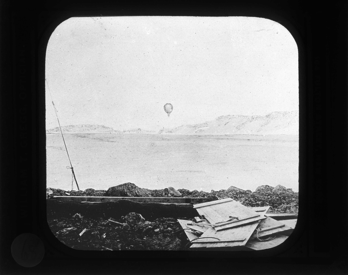 Ballongen Örnen har lyft. I förgrunden väggpartier från ballonghuset.