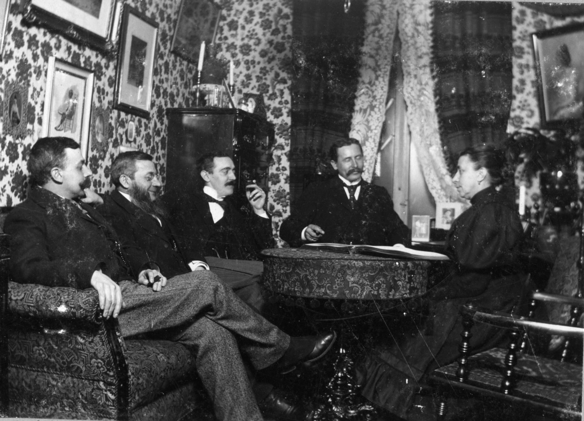 "Aftonunderhållning" Till vänster sitter Olof Edvard och därnäst hans pappa Olof Aron Sandberg. Kvinnan är Olof Arons hustru Clara Teresia. De andra männen är möjligen också söner i familjen.
