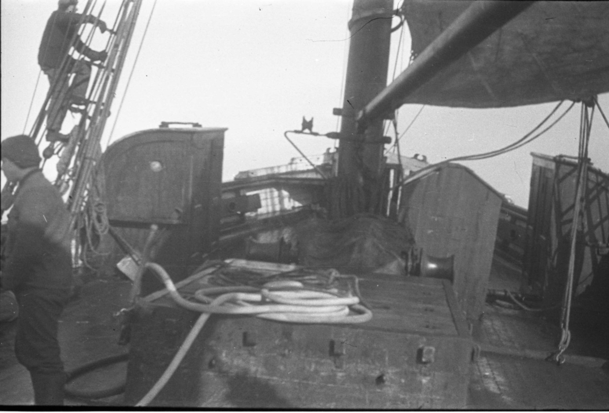 Ombord på Isbjörn, skepparen Skogvik klättrar upp mot utkiken. Sannolikt på väg mot Vitön.