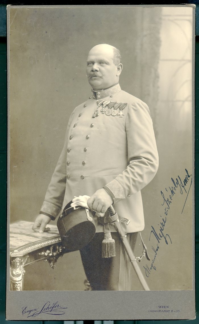 Kabinettsfotografi: sannolikt österrikisk-ungersk officer i uniform med medaljer på bröstet. Han heter möjligen Szekely.