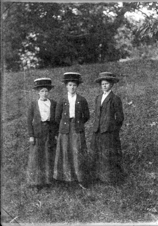 Tre unga kvinnor med stora hattar står vid en grässlänt.