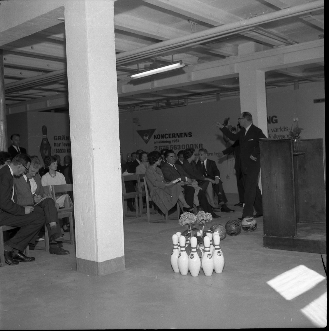 AMB Bowling i Gränna håller möte i en vitkalkad lokal med vita pelare - källarlokal. Intill en talarstol står en man och gestikulerar. På golvet ligger det bowlingklot och ett antal käglor märkta "AMF" står uppställda runt en blombukett. Det är möjligen bolagsstämma/årsmöte.