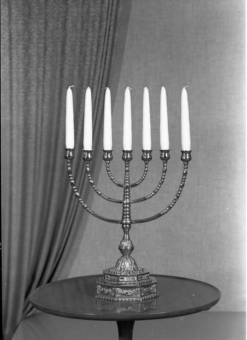 En 7-armad ljusstake i mässing med ljus står på ett runt bord. Produktfotografering för Bollings Eftr.