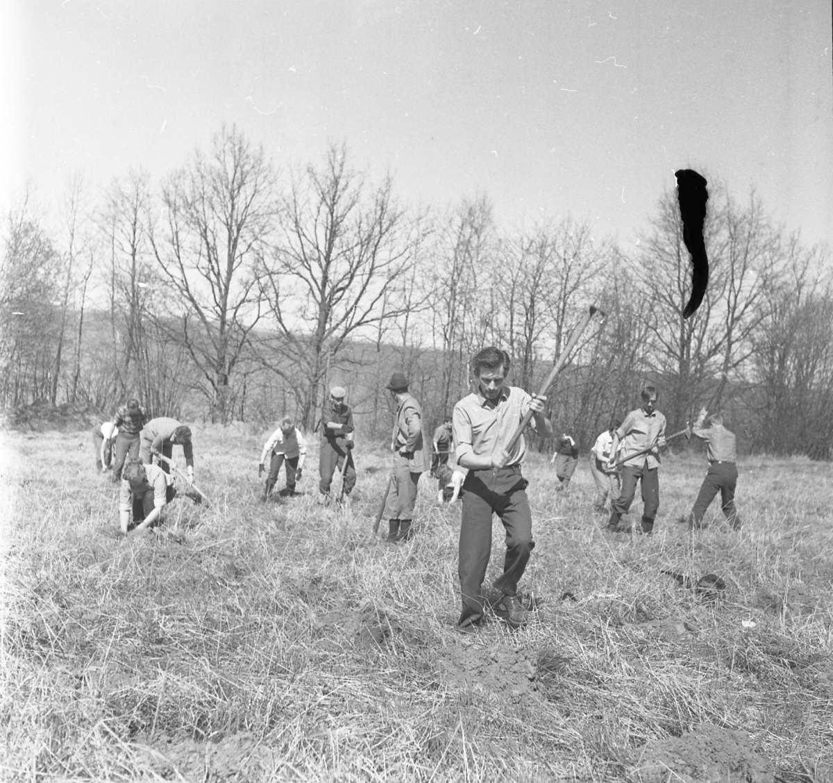 Skogsplantering på Röttles raster april 1961. Flera personer står med hackor och gör hål i marken. Några sitter på huk och planterar träd.