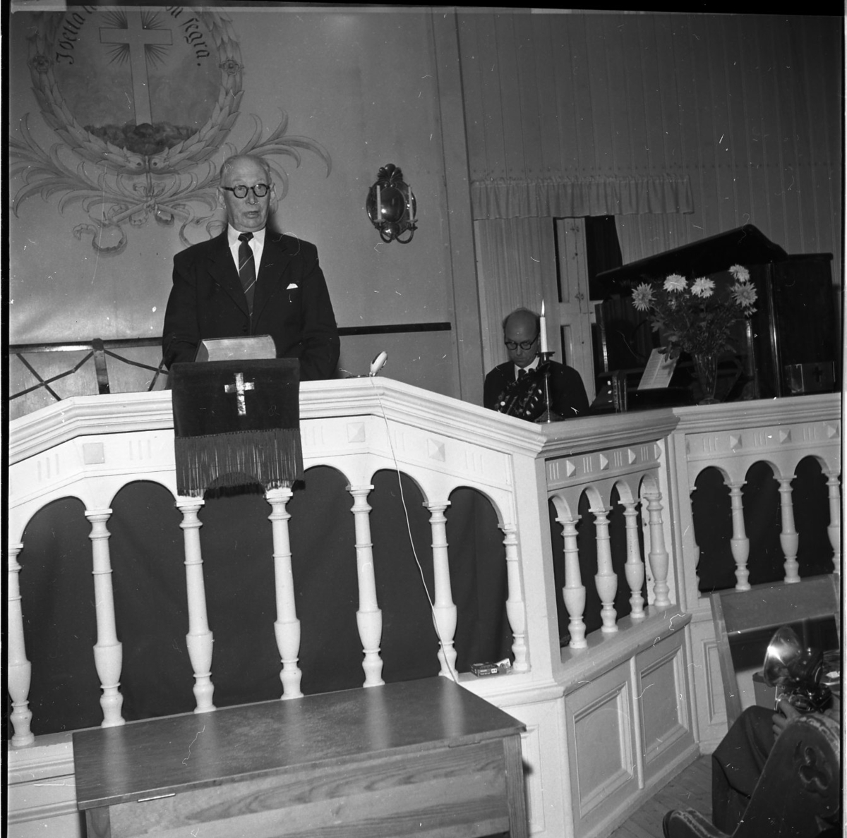 En man står vid en talarstol i en kyrka. Bakom honom är en väggmålning föreställande ett kors. Bredvid talarstolen sitter Nils Sjöberg och lyssnar.