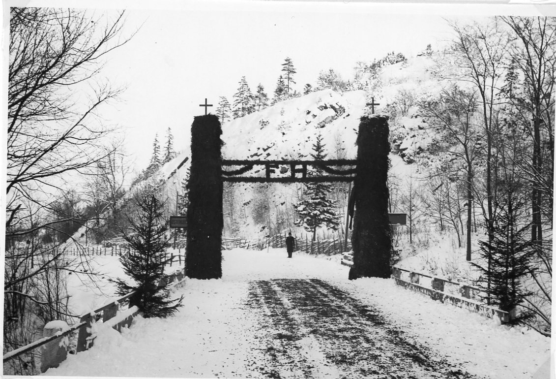 En portal med initialerna F H (Felix Hamrin) rest vid länsgränsen mellan Jönköpings och Östergötlands län. Det är vinter med snö på marken.