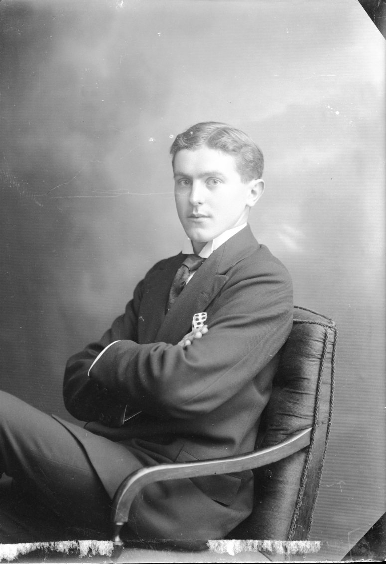 En ung man sitter i en fåtölj med armarna i kors. Prickig näsduk i fickan.