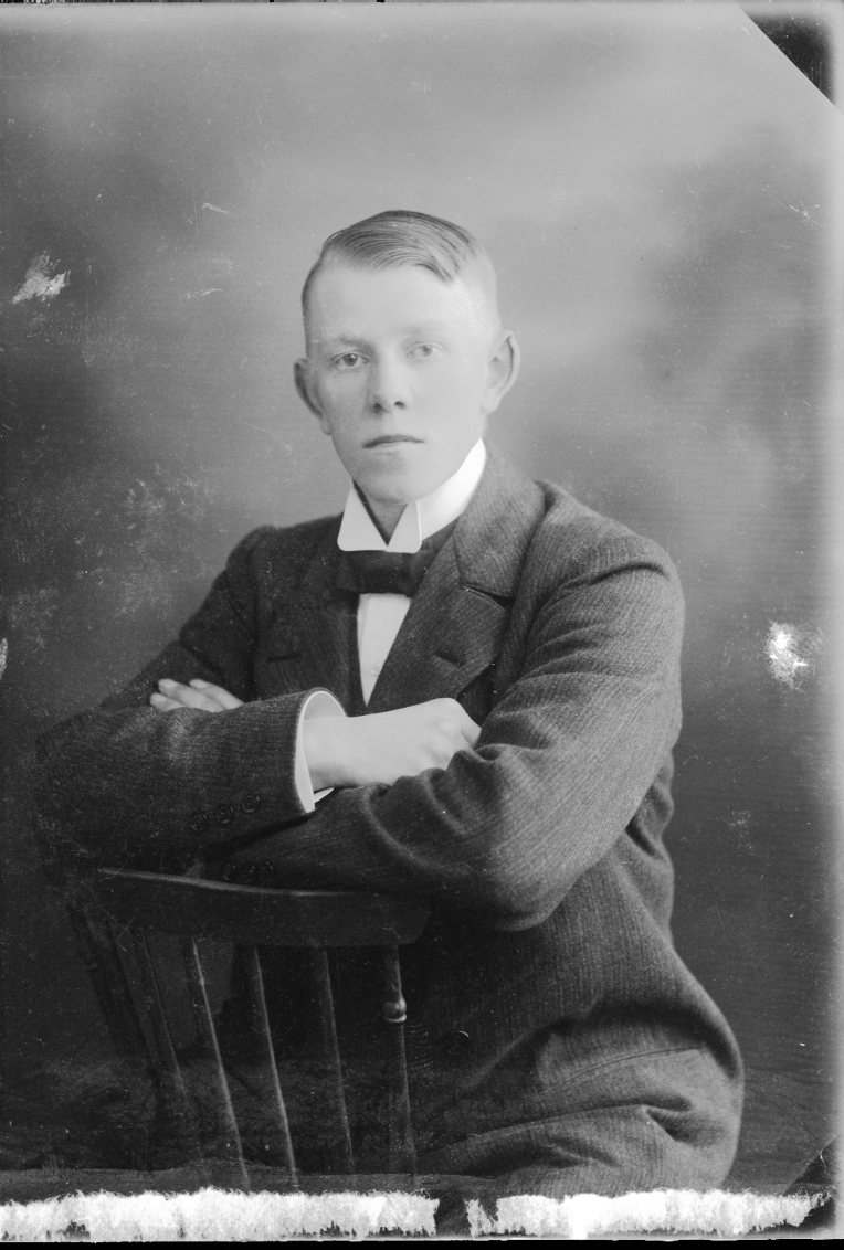 Porträtt av en ung man som sitter bak-och-fram på en pinnstol.