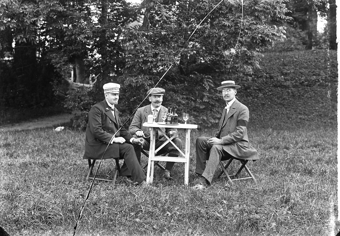 Tre män på en gräsmatta sitter på enkla stolar runt ett bord. På bordet står glas och flaskor. Mannen till höger har ett mörkt band runt överarmen.