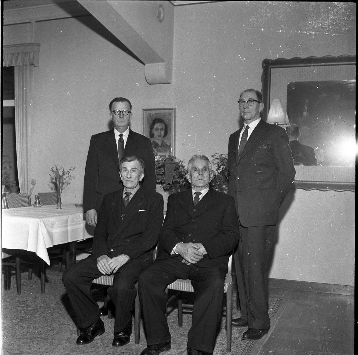 Fyra män poserar för fotografering. Två av den sitter på stolar och Ture Ekvall och en till står bredvid. De bär kavaj och slips.