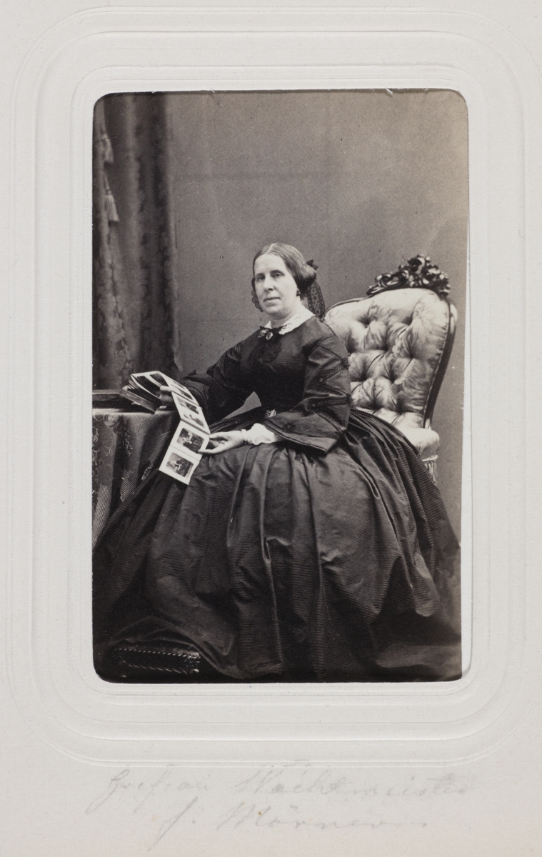 Grevinnan Wachtmeister med vikalbum. Ateljéporträtt ur fotoalbum utan inventarie- eller accessionsnummer märkt Arvedsson.