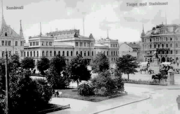 Från vänster Esplanaden, och en del av kv Rätten, kv Stadshuset och till höger kv Nyttan/Hirschska huset och Stora torget där torghandel bedrivs. Text till bild "Sundsvall Torget med Stadshuset". Vykort.