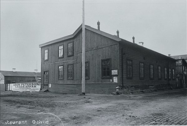 Restaurant Dahné på Storgatan 11. Populär nöjeslokal under uppbyggnaden av stenstaden. Där förekom även varitéuppträdanden och musikunderhållning. På bild syns också en reklamskylt för Aron Petersons Läderaffär. Vykort.