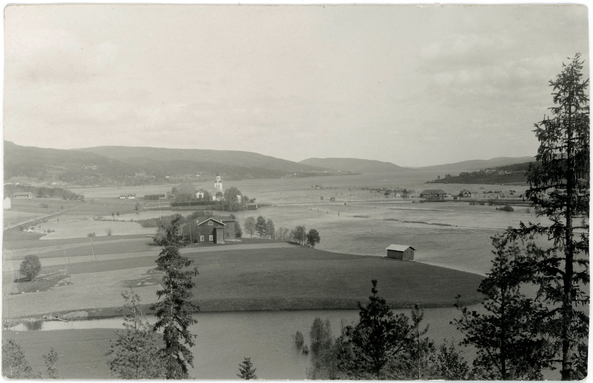 Vy över Stödesjön samt kyrkan från Huberget, högt vattenstånd. Åkern är numera bebyggd med småhus. Vykort.