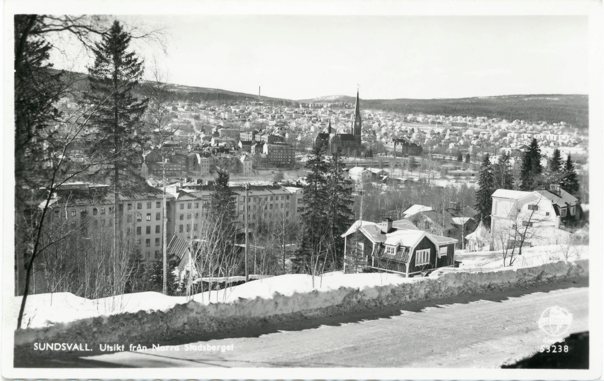 Vy från Baldersvägen västerut ner mot Sundsvalls stadskärna. Det ljusa huset till höger i bild har adress Baldersvägen 20. Vykort.