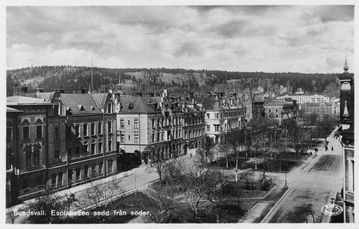 Motiv med Esplanaden sedd från söder. Från vänster Wikströmska huset, Sundsvalls Tidnings hus, Rönnholmska huset samt Centralhotellet. Vid gatans slut magasinshuset Fregattskeppet som revs 1973.