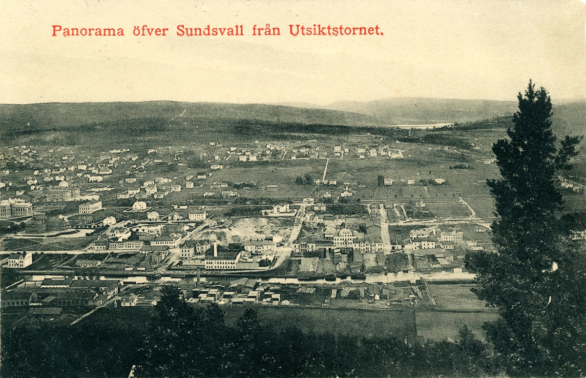 Vy över Norrmalm och Västermalm. Tryckt text till vykortet "Panorama öfver Sundsvall från Utsiktstornet."