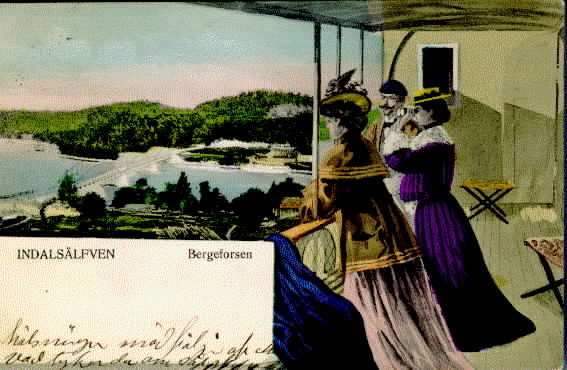 Kolorerat vykort med utsikt över Indalsälven vid Bergeforsen.