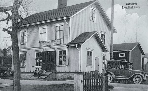 Vivstavarvs Kooperativa Handelsförening. Fyra pojkar sitter på affärsbyggnadens trappa. Vykort.