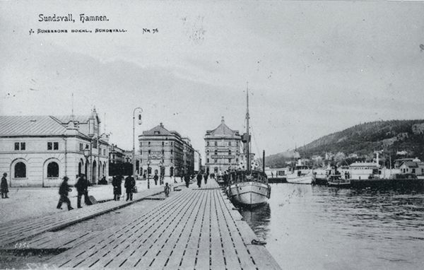 Hamnen i Sundsvall. Stockholmskajen, passagerarbåten Ljungan, tullpackhuset t v, Hamnmagasinen i bakgrunden. Vykort.