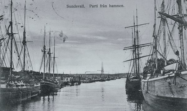 Vy från hamnen med många fartyg vid kajerna. Vykort.