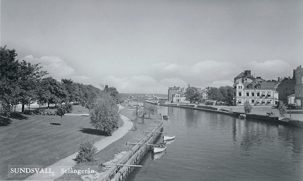 Selångersån med Badhusparken till vänster. Bilden är tagen från Storbron. Bildtext till vykort "Sundsvall. Selångersån".