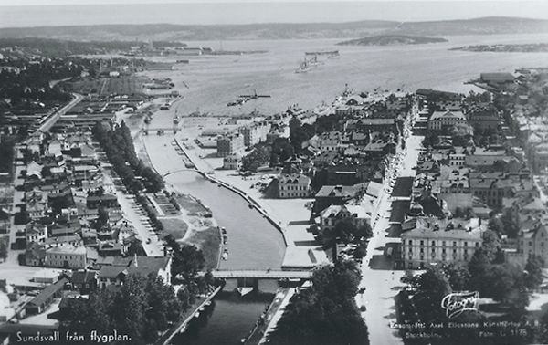 Flygfoto över centaral Sundsvall. Bildtext till vykort "Sundsvall från flygplan."