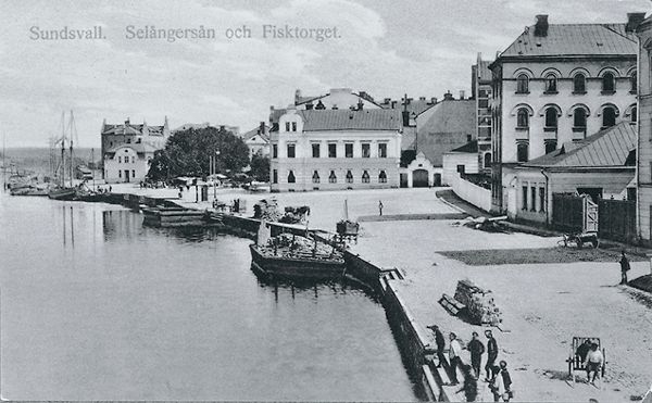 Bildtext till vykort "Sundsvall. Selångersån och Fisktorget."