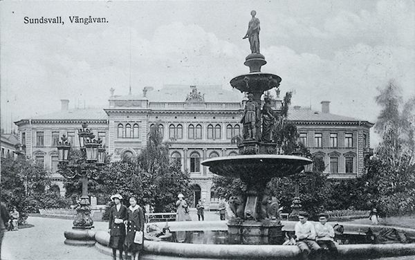 Kvinnor och barn vid Vängåvans fontän, i bakgrunden Sundsvalls Enskilda bank. Tryckt text på vykortet "Sundsvall, Vängåvan."