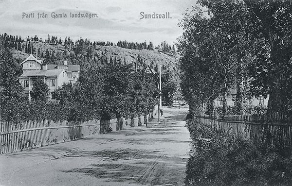 Ett avsnitt av Baldersvägen. Bildtext till vykortet "Parti från gamla landsvägen. Sundsvall."